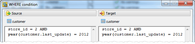 To reduce the volume of data to be compared, specify the WHERE condition. This condition allows to filter data and compare and synchronize only data subsets.