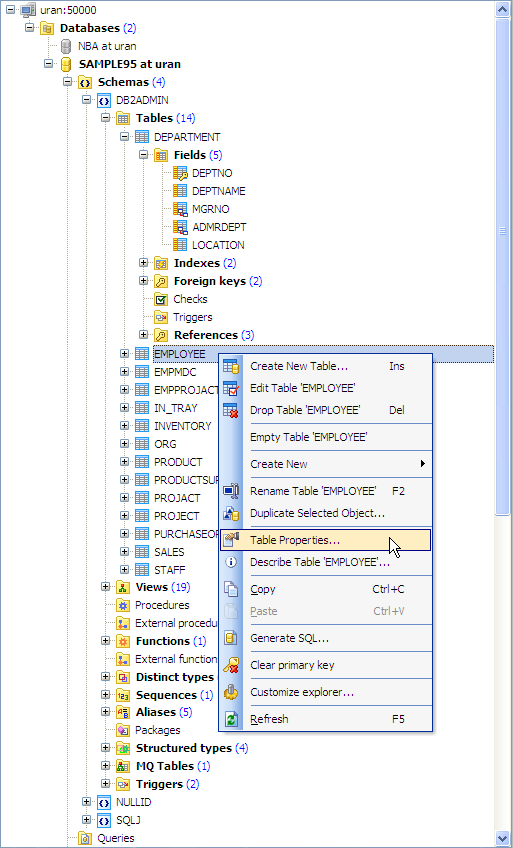 Database Explorer allows you to perform the following operations with database objects using its popup menu (note that the popup menu contains object-specific items only when some database object is currently selected in the explorer tree):