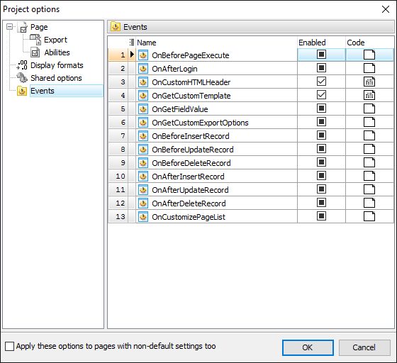 To specify a handler for a global event, switch to the Events tab of the Project options dialog and double click the appropriate line in the grid.