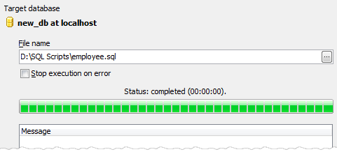 To execute a script with Script Runner, set the file name and the Stop execution on error option value. This option allows to view all the execution errors (OFF). The specified script will be executed immediately on the database which name is represented at the top of the window.