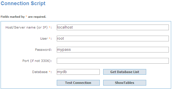 Note: You are actually connecting to your database through the PHP script on the server, so in most cases the host/server name is "localhost" unless the target database server is not installed on the same computer as the Web server. |
