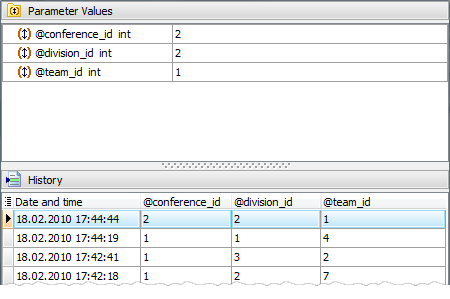 MS SQL Maestro supports Parameter History. Values that have been set previously as the routine parameters are represented in the History tab of the Input Parameter dialog with a date and time of their last using. Double click a necessary set of values to set them as the routine parameters. You can manage the Parameter History with Delete history item and Clear history links.