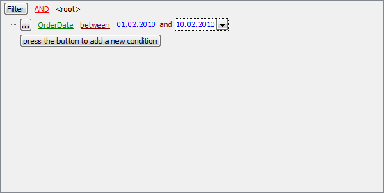 Suppose we need to select orders from the sample table Orders made between 01.02.2010 and 10.02.2010. These criteria are applied to the OrderDate column. Press the button to add this condition. Alternatively, you can use the Filter button and select the Add Condition option from the drop-down menu.