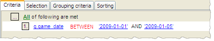Criteria tab allows you to set the selection conditions. To add a condition, click the button on the left and select the Add condition item in the popup menu. Edit the condition by clicking its parts and setting their values. Clicking the button to the left of the condition string activates the popup menu which allows you to add a new condition of the same enclosure level, add a new enclosure level, delete the current condition, open or close the condition if it is composite.