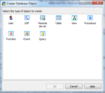 The Create Database Object dialog allows you to create any type of database object supported by SQL Maestro for MySQL. To open the dialog select the Object | Create Database Object... main menu item or use the Shift+Ctrl+N hot keys combination. Select an object type icon and click the OK button to invoke the corresponding wizard or dialog.