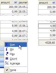To get a sum of column values, a min or a max value, an average column value or an amount of records, use Data Grid Footer. Select the Footer item at the grid caption's popup menu.