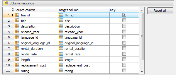 To determine which rows correspond to each other, specify the Comparison Key. The Key includes columns to be identified on two rows comparison, and the differences of the rows to be compared. By default, the comparison key is set according to the table primary key, but if the primary key does not exist you have to specify it manually. In case the key is not specified the comparison of the tables is impossible.