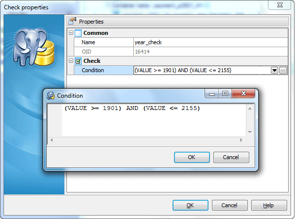 The Check Properties editor allows you to add a new check constraint or edit an existing one. This dialog can be invoked from Table Editor, or via the popup menu of the corresponding nodes of the explorer tree.