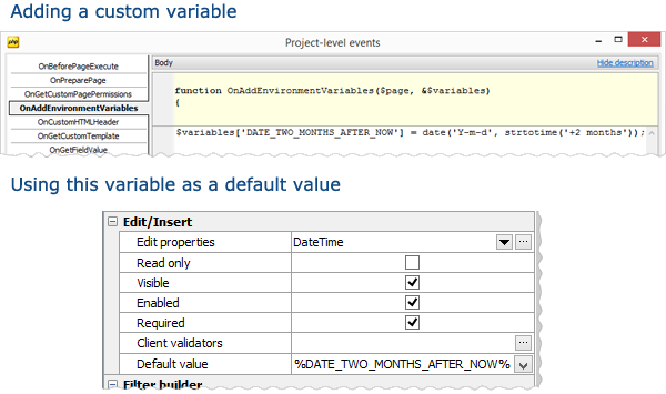 | • | custom environment variables to be used in any server-side event of the concrete page (specified within the OnAddEnvironmentVariables event handler) and in any server-side event of any application page (specified within the global OnAddEnvironmentVariables event handler). Such variables can also be used in lookup filter criteria, on data filtering, and as default values. |