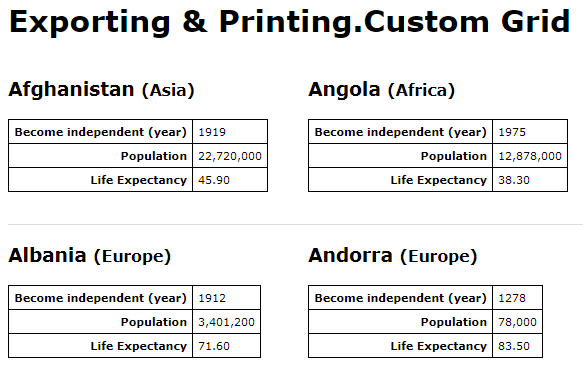 This example learns how to implement a two-column version of the printer-friendly page. It can be seen live in our Feature Demo that also contains an example of customization templates for printing a single record. You can study these examples online or download the demo project file for a deeper investigation.