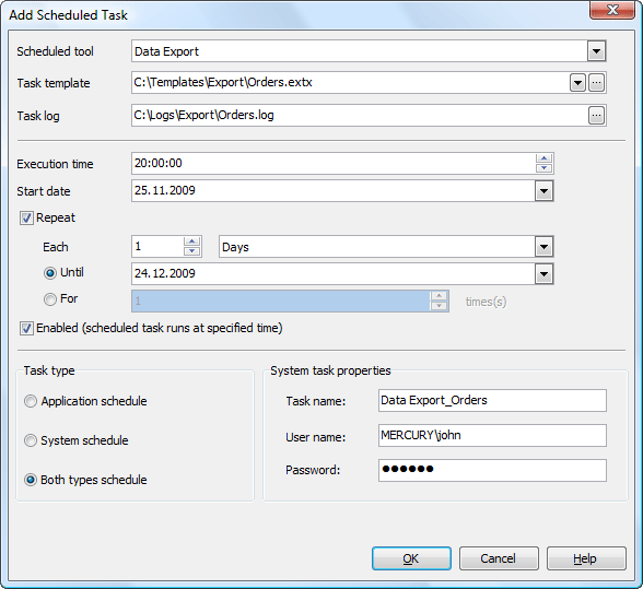 To add a task to the scheduler, use the Add Task button at the Ribbon toolbar or open the Task Scheduler page and click Add Task at the Navigation bar or at the area's popup menu. The Add Scheduled Task window will appear. Fill the window fields and click OK.