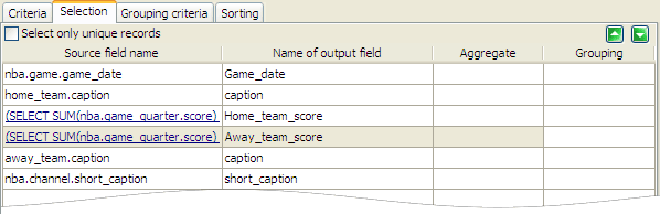 In case the alias is used as the expression's column name use the Selection tab displays the output fields of the query. It allows you to edit the names of the query or CASE output fields, set their displaying order and set the aggregate functions (SUM, MIN, MAX, AVG, etc.) for each field.