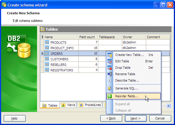 | • | Open the corresponding tab (Tables - to manage schema tables, Views - to manage schema views, and so on); |
