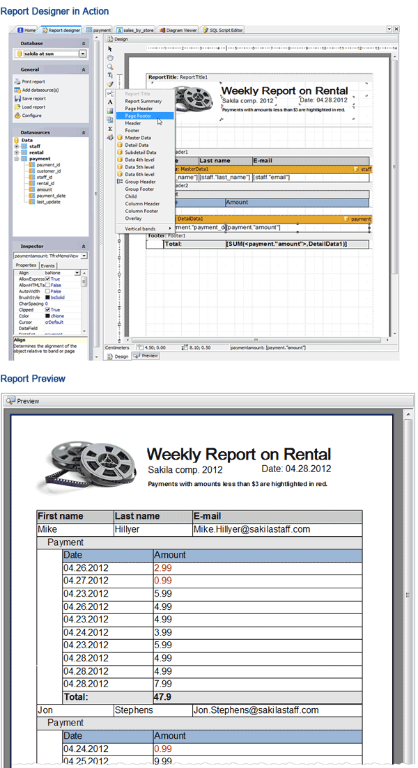 Report Designer allows you to create database reports, define reports appearance in your own style, equip it with master-detail data views, aggregate functions, and images and control the result with the ability of simultaneous previewing. To run Report Designer, choose Tools | Report Designer main menu item.