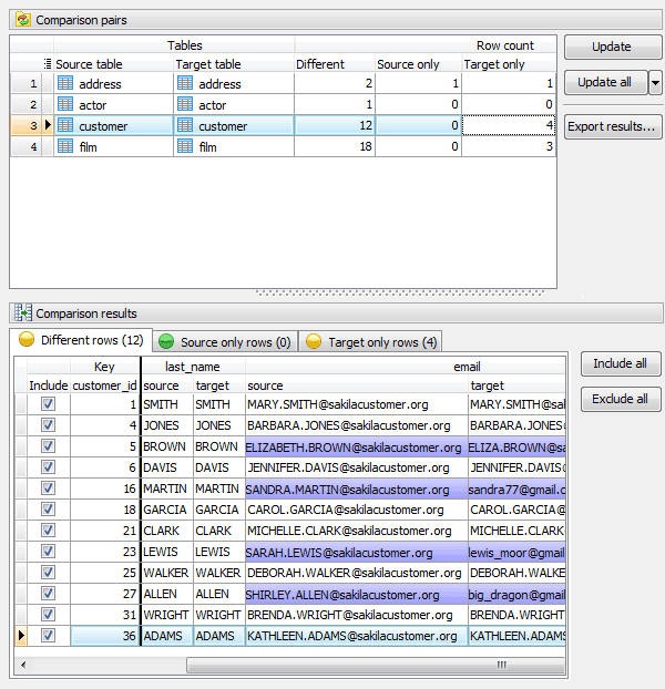 Rows that exist in both databases but are not identical. The differences are highlighted. |