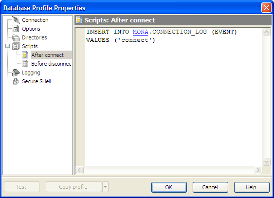 Below you can find an example of an obligatory script to execute after MaxDB Maestro will connect to the database. The script writes a connect time to the log table.