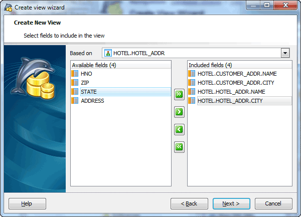 Select a table or a view from the Based on drop-down menu. Then specify which fields will be used in the new view. Use Add All or Add Selected buttons to include field(s) into view definition. Use the Remove Selected or Remove All items to exclude field(s) from the view's field list. Click the Next button to proceed.