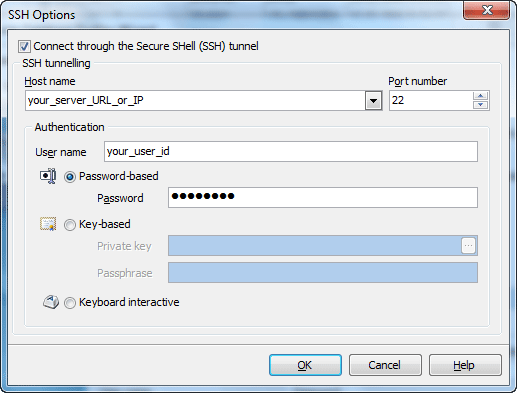 Key-based Specify the path to the Private key file with the corresponding Passphrase to log in to the remote server. PostgreSQL Code Factory accepts keys in ssh.com or OpenSSH formats. To convert a private key from PuTTY's format to one of the formats supported by our software, use the PuTTYgen utility that can be freely downloaded from the PuTTY website.