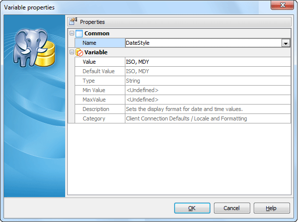 Database Variable Editor is the basic PostgreSQL Maestro tool for creation a new database variable or working with existing one. It allows to specify the value of the variable. Several options can be specified for the database variable that govern the expected behavior of the database system.
