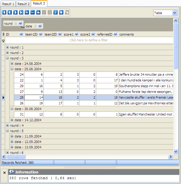 You can group grid data by any of the columns by dragging the column header to the destination area. Now all the records are displayed as subnodes to the grouping row value as shown in the picture. To reverse grouping, just drag the column name from the upper area back.