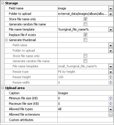 To activate multi uploading for a page, turn ON the Enable checkbox above the grid, then setup storage properties and (optionally) upload area options as described below.